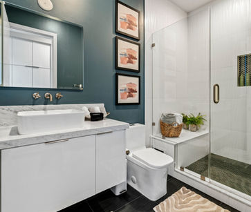 Hallway Bathroom: Walk-in shower, sink, and a toilet.